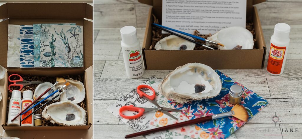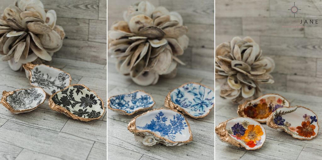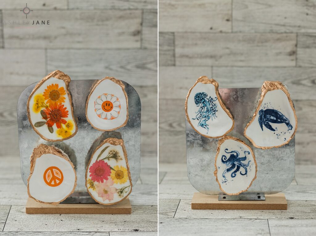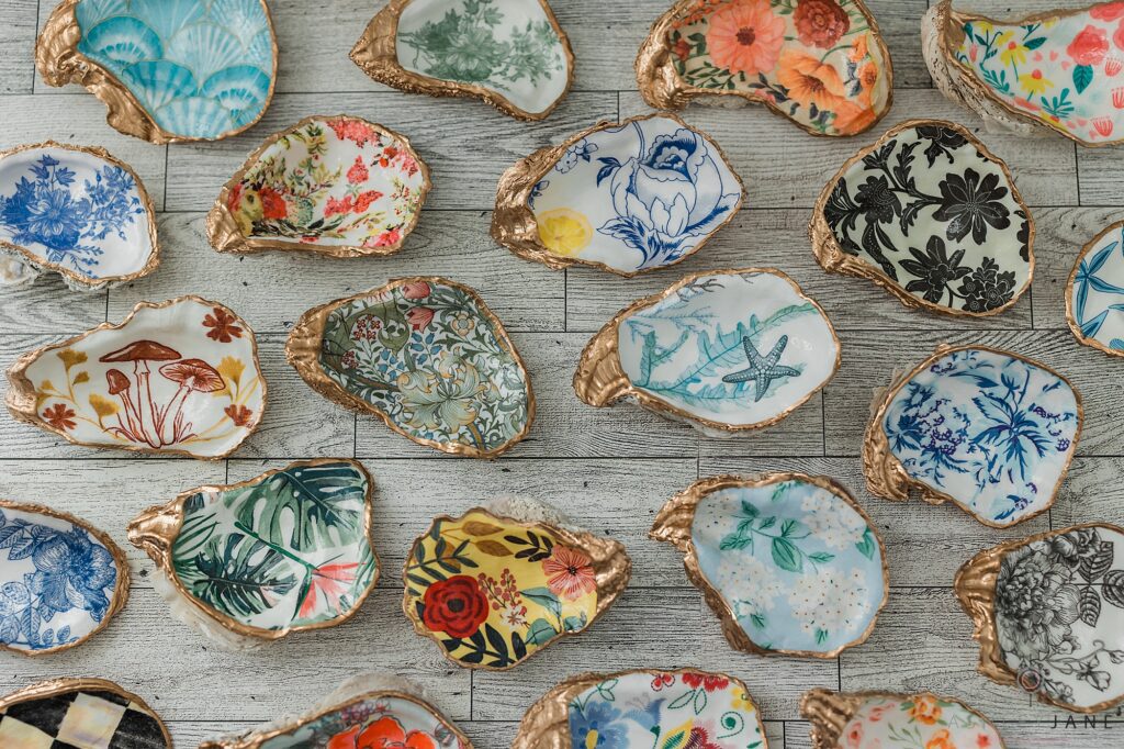 Every piece starts with selecting the perfect shell — shape, texture, and character all matter because each one is completely unique. From there, I use decoupage to layer on delicate patterns with napkins or carefully pressed flowers, building the design by hand. Once the design is in place, I add finishing touches like gold edges or personalized details, making sure each piece feels balanced and intentional. I love that no two oysters are ever the same — my job is to enhance their natural beauty and transform them into meaningful, lasting keepsakes.